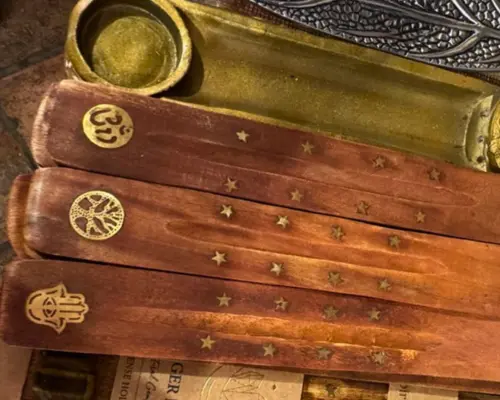 Dale a tu ritual de incienso un toque artesanal y elegante con este soporte de Incienso, diseñado en madera natural con detalles incrustados de latón. Ideal para quemar varillas con estilo mientras mantienes tu espacio cuidado, relajado y ordenado.
